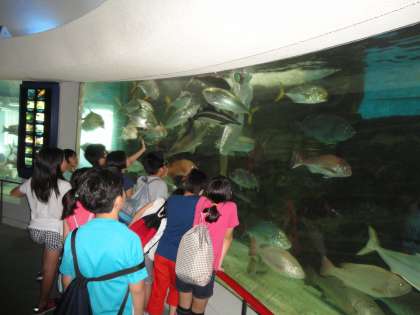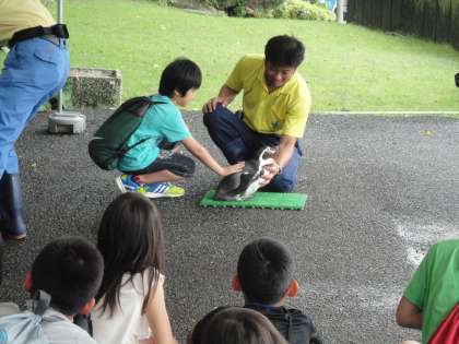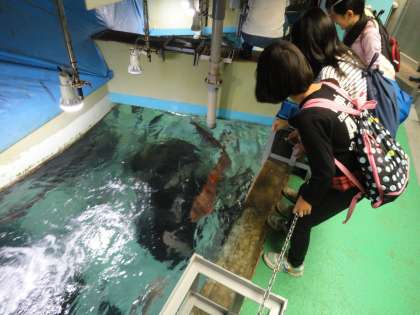 マリンランドでは,餌やり体験,ペンギンタッチをしました。館内の水槽を見て回り,海女さんによる餌やりの実演も見ました。