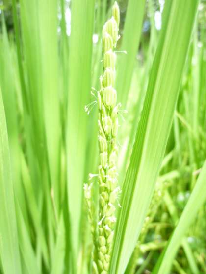 ゆめの森で育てている稲に,9月上旬,白い小さい花が咲きました。大きくなってきた穂がすずめに食べられてしまわないように,キラキラのテープをはりました。今回も,地域の田んぼの先生にお世話になり,肥料をまき,テープをはっていただきました。子どもたちはその様子を,