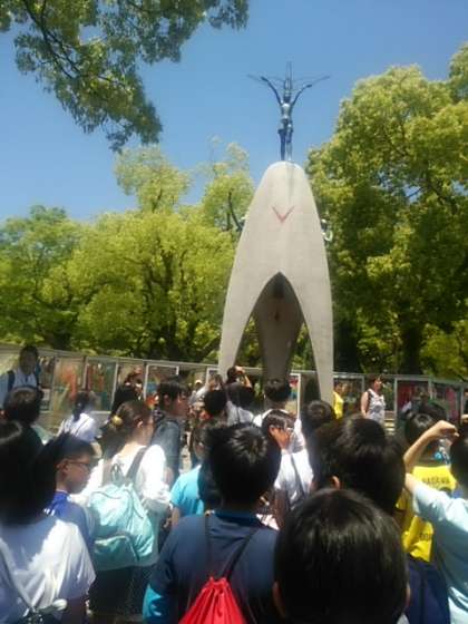 6年生の子どもたちは,無事,広島の平和記念公園に到着しました。全校のお友達に協力してもらって作り上げた千羽鶴を捧げ,平和の誓いをしました。原爆ドームや原爆資料館を見学したあと,原さんからお話をお聞きします。