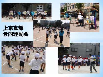 青空のもと正親小学校の運動場で,上京支部育成学級・支援学校合同運動会が行われました。仁和小学校なかよし学級の4人の子どもたちも元気に参加しました。