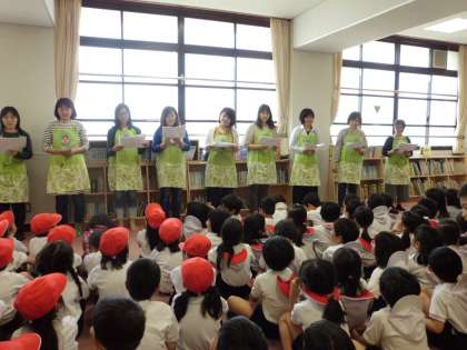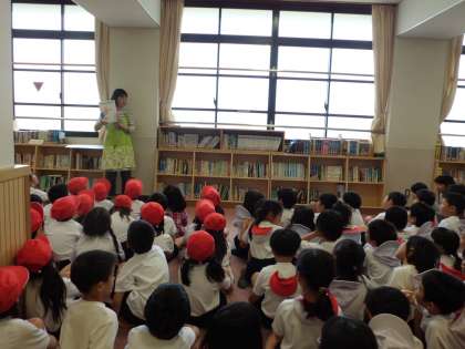 本校の図書ボランティアさんのみなさんが主に1年生のみんなにたのしい読み聞かせをしていただきました。早口ことばの時間もつくってくださりました。おもわず1年生も一緒に早口言ことばにチャレンジしていました。絵本の読み聞かせにも食い入るように聞き入っていました。皆様ありがとうございました。今後ともよろしくお願い申し上げます。
