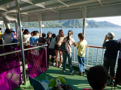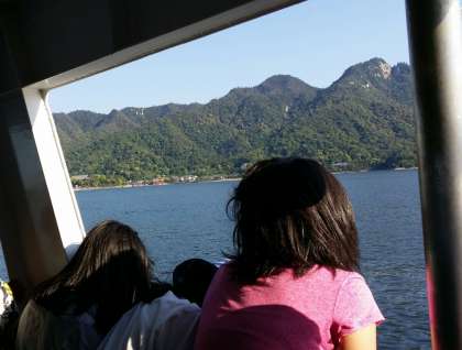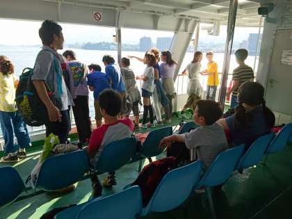 平和記念公園の後は,宮島へ移動です。フェリーの上でさわやかな風にふかれ,いよいよ宮島です。