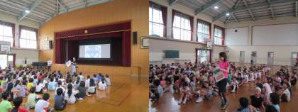 いろいろな国の「こんにんちは!」を紹介しながら,今月の人権目標「いろいろな国の素敵を見つけよう」のお話もありました。