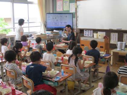 昨年度もお世話になった6年生はもちろん,今年度からお世話になっている3〜5年生のみんなも名残惜しそうでした。今回もゲームを通して英語に親しむ活動をお手伝いしていただきました。最後の給食は,学習では接する時間がない,1年生教室で食べていただきました。
