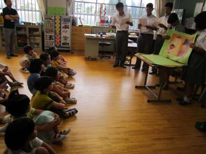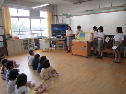 大きな絵本を準備して持ってきてくれました。1年生のみんなは,目をらんらんと輝かせ,よみきかせを楽しんでいました。