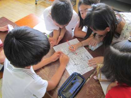 夏休みを目前に控え,町集会がありました。町ブロックごとに夏休みの生活のしかたや住まいの近くの危険な個所について話し合いました。小グループで話し合ったり,地図を大きく映し出したりして,工夫しながら話し合いをしました。
