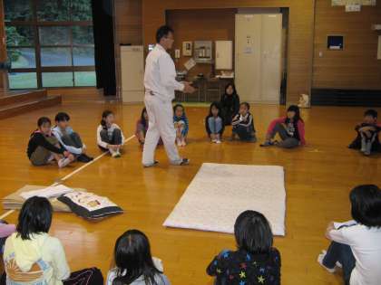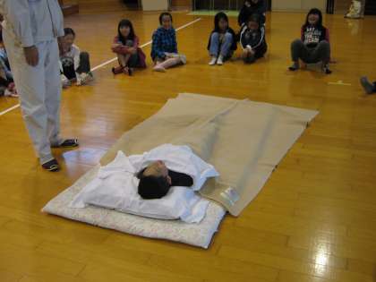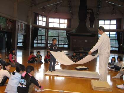 みさきの家の先生から,泡トイレの使い方,寝具の使い方について説明してもらいました。毛布のたたみ方やシーツのたたみ方は難しかったです。