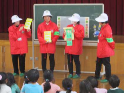 19日(木)に交通安全教室を行いました。上京警察署,交通安全会,平安レディースの方々にお越しいただき,交通安全や防犯についてのお話をしていただきました。