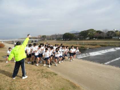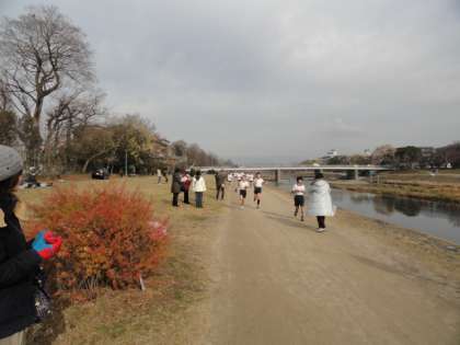 鴨川の河川敷(荒神橋〜丸太町橋)の周回コースを高学年は40分間,中学年は35分間,低学年は30分間の間に何周走れるかを競い合います。