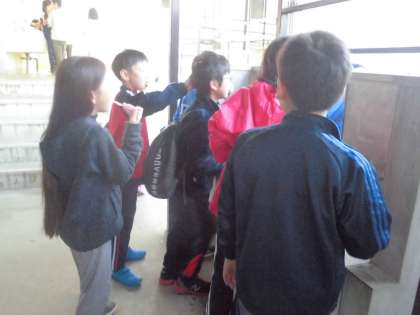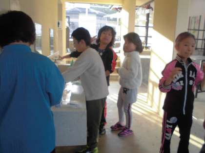 朝になりました。よく眠れた人も、あまりよく眠れなかった人も鳥の声で目覚めました。近くを通る漁船の音が朝早くから仕事をしておられるのだなと感じながら起き出しました。バンガローから拠点の60畳まで戻り朝の準備です。寝ぼけ眼の人もいますが、朝の集いに遅れるわけにはいきませんので、5分前行動をしました。