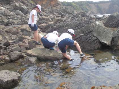 10時が一番引き潮なので、できるだけ早く浜に行こうと頑張りました。浜につくとヤドカリが大群でいたり、ナマコやカニ、イソギンチャクも見つけました。魚も取った人もいてとても楽しかったです。