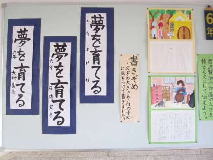 6年の掲示板は,「書き初め」と「宮沢賢治の作品の推薦文」です。