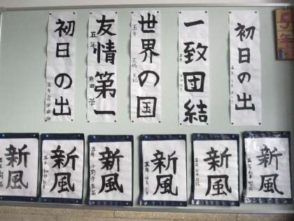 5年生の掲示板は,「習字の作品」です。学校で書いた作品と冬休みの宿題で書いてきた作品です。