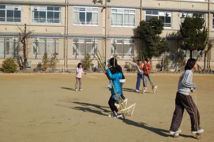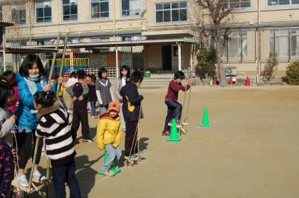自分たちで作った竹馬やかんぽっくりを使って競争をしました。