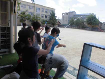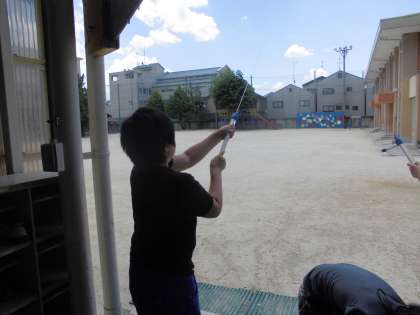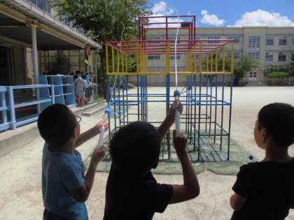 水に力をかけると空気とは違って手ごたえがあります。空気だと限界になるまでギュッと縮まった空気は元に戻ろうとした力がかかり,その圧力で球を飛ばします。だから勢いよくぽんと飛び出ます。