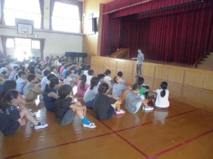 様々な災害がある中ですが,今日は防犯の避難訓練です。不審者が入ってきたときに教職員はどうするのか,子どもたちにはどう伝えるのか,子どもたちは万が一の場合どこに避難するのか,もしものことはあってはならないのですが,その時にパニックにならないために練習をしました。そして,万が一の場合には体育館に逃げ込むことを確認しました。みんな真剣に取り組みました。