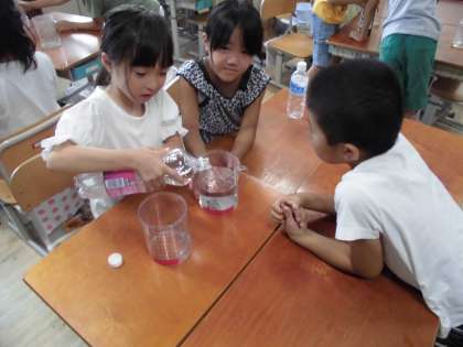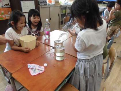 入れ物の水が入る暈を調べました。いえからもってきた入れ物に水を入れ,何L入るか予想してから1Lマスに入れて,何倍分か量りました。机がべちゃべちゃになりながらも楽しく量れました。「この入れ物は2Lや」「こっちは,もっとたくさん入るかと思ったけど,同じ2Lや。」など生き生きと活動ができ,入れ物に入る水の量の感覚ができていきました。