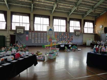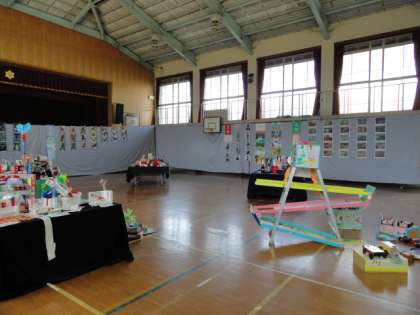 体育館に子どもたちの作品が展示してありますので,ぜひご覧ください。