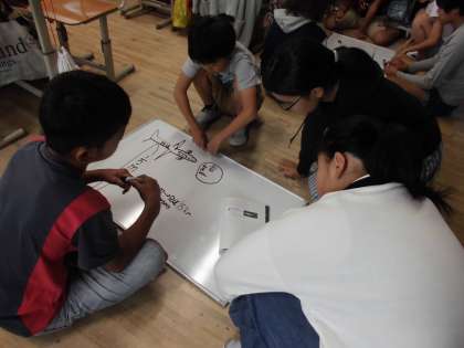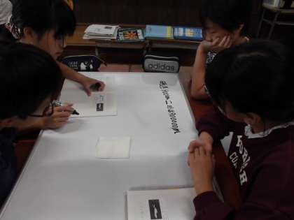 6年生は単位の変換をしています。時速60キロメートルとを秒速に,秒速10メートルではどちらが早いか,グループで方法を考えていました。ホワイトボードで自分たちの考えを出し合いながらまとめていきました。