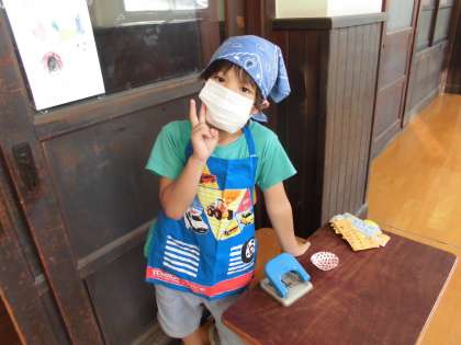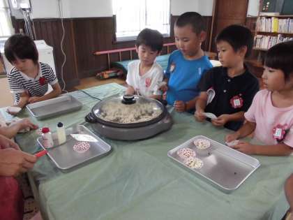たんぽぽ学級のみんなで力を合わせて育てたにポップコーンが収穫できました。それを乾かしてポップコーンを作り,ポップコーン屋さんで学校中のみんなを招待してふるまうことに決めました。最初は一年生。一年生のみんなに「おいしいね。ありがとう。」といわれて,たんぽぽのお友達も大満足でした。笑顔がいっぱいのひと時でした。