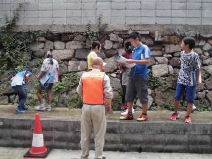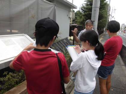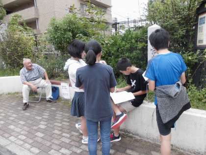 正親の地域をウォークラリーの形で巡りながら地域にお住まいの方から,そこの歴史についてお話をいただきました。豊臣秀吉の時代に聚楽第があった場所から出土した石の写真や堀の石垣など地域にありながら今まで気が付かなかったところのお話を聞き,子どもたちもびっくりしていました。地域の皆様ありがとうございました。