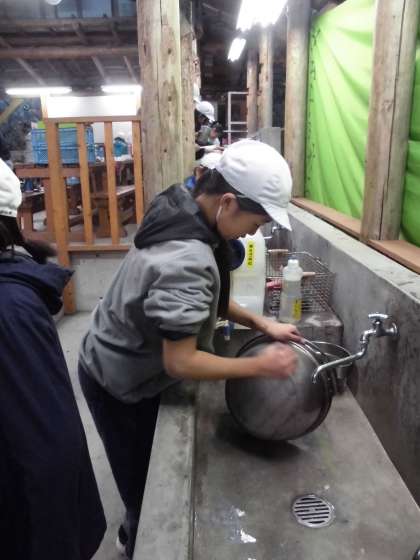 おいしくいただいた班から片づけです。山の家の先生から、「元の鍋よりもぴかぴかだね。さらっびんみたいだ。」と言っていただきました。片づけも完璧で、とても早く終わりました。
