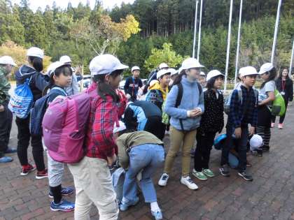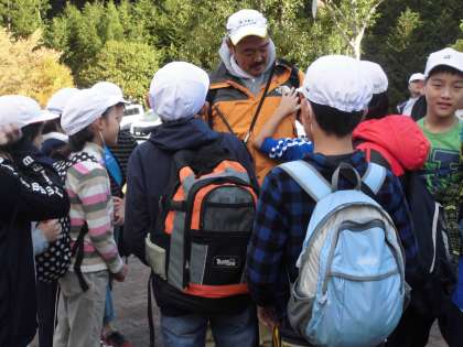 いよいよ登山の出発です。一緒に上ってくださったのは、なんと、「鴨脚校長先生」です。以前にお話を伺った時のように、「ピシっ、バシッ」とお話を伺いました。要所要所で子供たちの成長をほめていただきながら登って行ったので、とても楽しく登れました。