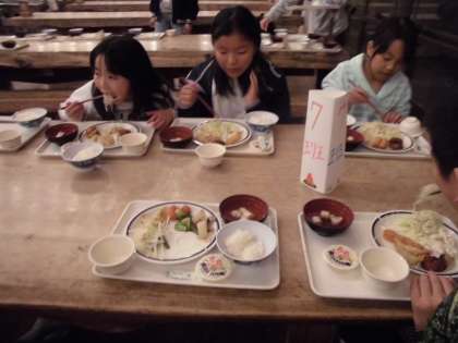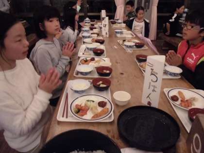 食堂での食事は二回目になりました。夕食はとても豪華でした。エビフライにハンバーグ・あげ餃子とサバ。いろいろな料理が好きなだけとれます。集合が遅くなって少し怒られてしまったけれど、しっかりと食べて明日からまた頑張ろうと思います。今から、天体観測です。たくさんの星が見えたらいいなと思います。