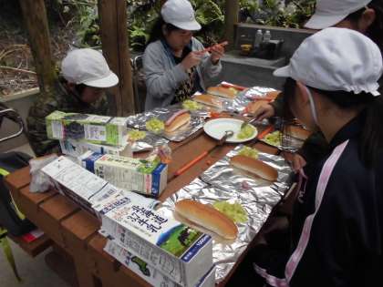 牛乳パックにアルミホイルで包んだパンとキャベツ・ウインナーをを入れ、火をつけるとパックドッグの完成。簡単においしくいただきました。後片付けまで丁寧にスムーズにできました。これは災害が起こった時に使えそうですね。