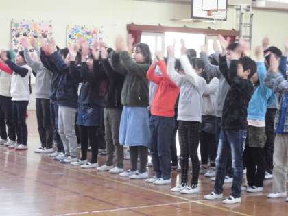 5年生がリーダーとなって「6年生を送る会」を開きました。それぞれの学年が工夫した発表がありました。6年生一人一人の名前を呼んでメッセージを送る学年,歌で送る学年,ダンスで送る学年いろいろあって,見ていても楽しかったです。縦割りで一緒にクイズに挑戦したり,メッセージや写真を貼ったプレゼントをしたりしました。最後はアーチで見送りました。