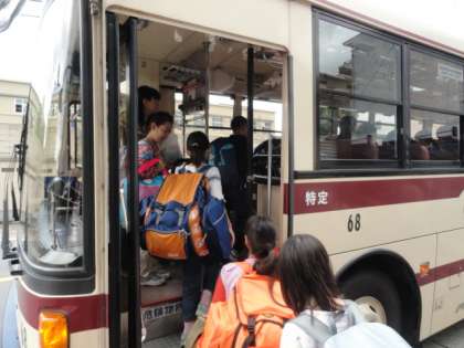 朝、クラス全員がそろって出発式をした後、バスに1時間ほど揺られて花背山の家に着きました。入所式を済ませ、山の家の活動が始まりました。