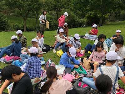 花背山の家の敷地の中で,みんなで楽しくお昼ごはんです。持ってきたお弁当を美味しくいただきました。気持ちがよい風が吹いています。