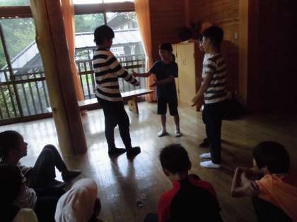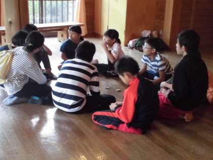 山から下りてきてほっとした自由時間です。王さんゲームや指遊びなど、男女入り混じって楽しく時間を過ごしました。