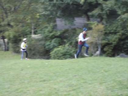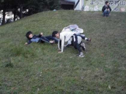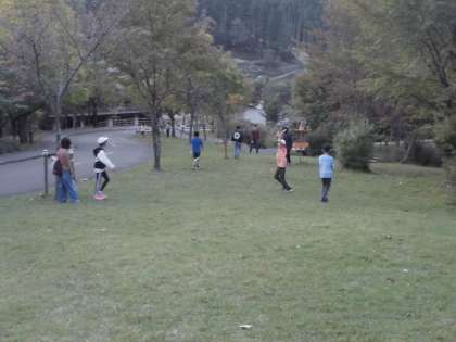 山から下りて、少し時間があったので、一日目にやった芝生すべりのような外遊びがしたい人と、疲れたので中遊びがしたい人と別れました。外遊びはいろいろ鬼ごっこと芝生すべり、中遊びの人は、人文字や腕相撲などいろいろ工夫して遊びました。