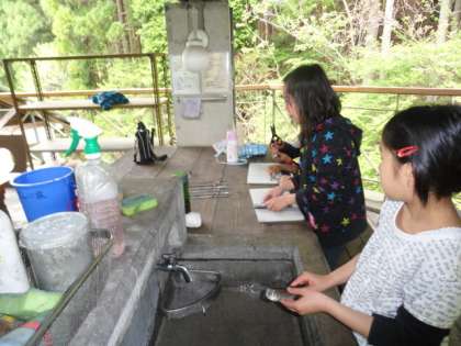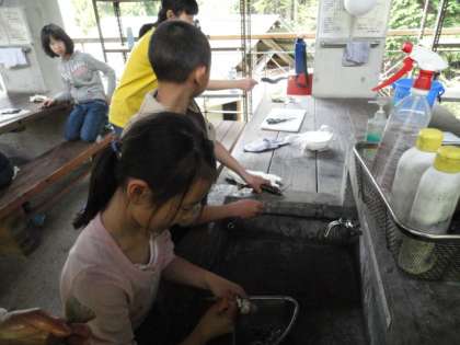 初めに魚のさばき方を山の家の方に教えていただきました。