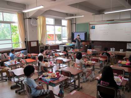 担任の先生から,今日のメニュー「ツナサンド」のつくり方を教えてもらいました。子どもたちは,教えてもらった通りに具を上手にパンにはさんで,ツナサンドをおいしそうに食べていました。
