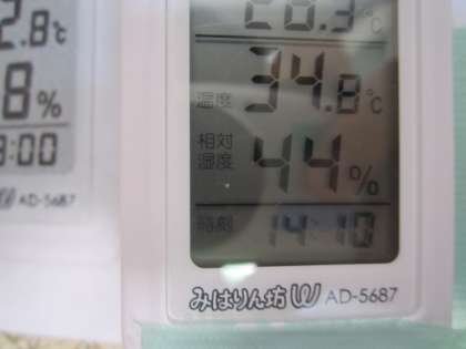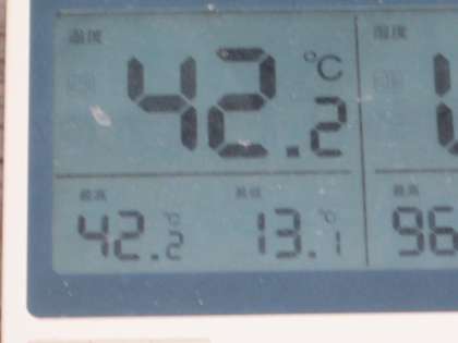 午後2時ごろ,校庭の温度計を見ると42.2度を示していました。校舎内の温度計で34.8度を示しています。梅雨が明け,一気に「夏本番!」です。
