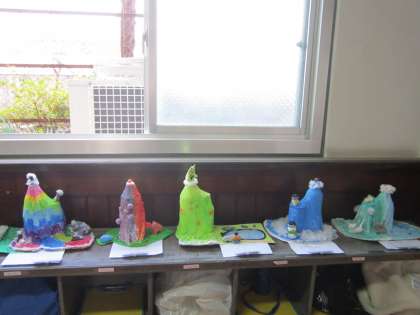 4年生の教室前廊下に,図工作品が展示されています。4年生の子どもたちが制作した「トロトロ カチコチ ワールド」の作品です。材料を上手に使って,自分が考えた世界を表現しています。素敵な作品に仕上がっています。