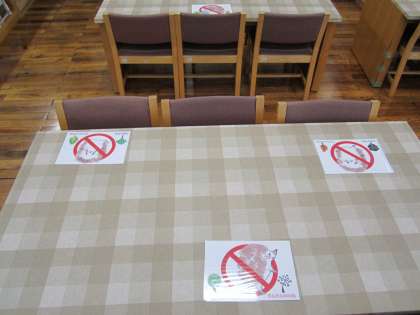座席は間をあけて座るなど,感染拡大防止に気をつけて閲覧できるようにしています。子どもたちが安心して図書館を利用できるように,図書ボランティアのみなさんが掲示等をしてくださりました。