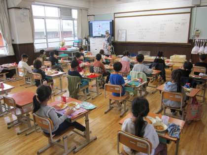 今日の献立を担任の先生といっしょに確かめ,「いただきます」のあいさつをしてから給食を食べました。