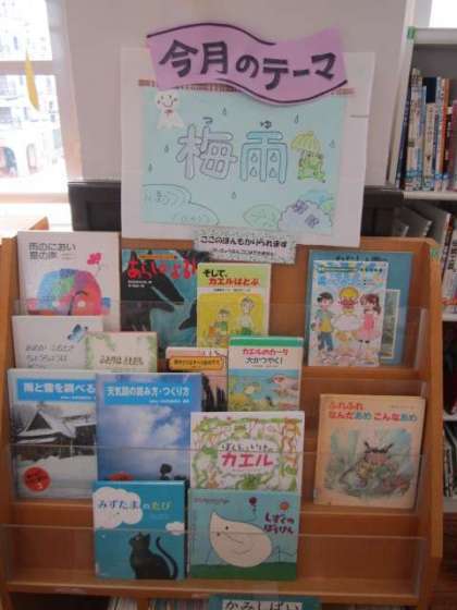 今月のテーマは「梅雨」です。テーマに関係のある本のコーナーや掲示物を,図書ボランティアのみなさんがつくってくださりました。