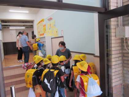 1年生が担任の先生から,靴箱の場所や傘置場について,教えてもらっていました。子どもたちは「ピカピカだ!」と言いながら,先生の話を聞いていました。