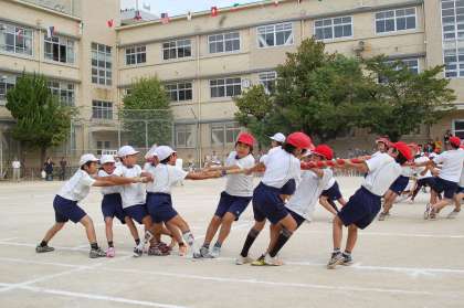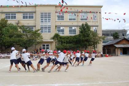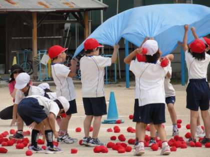 次は,1,2年生の「追い出し玉入れ」でした。ブルーシートに入った玉をシートを動かして,追い出していくのですが,みんなの息が合ってないとうまく追い出せません。