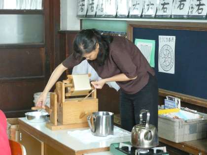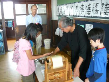 校区にある織物屋の方にお世話になり,それぞれの子どもたちが世話をしてきました。育ててきたかいこが繭を作ったので,その繭から糸を取り出すところを見せていただきました。自分たちの手でどれくらいの長さになるかも体験しました。
