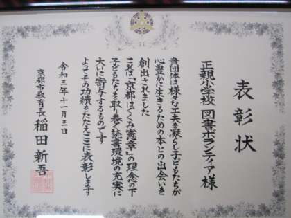 子どもの読書活動に関して優れた実践に取り組む団体等を対象とした「京都市子どもの読書活動優秀実践団体表彰」において,教育長賞の表彰を受けられました。