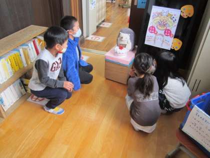図書館前では,図書ボランティアさんが作ったお誕生日ケーキで,らんちゃんのお祝いをしました。子どもたちが「おめでとう!」とらんちゃんに言っていました。