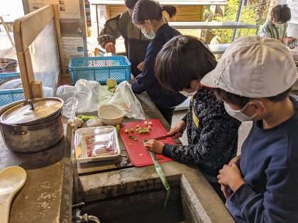 野外炊事が始まりました。昼食で,すき焼き風煮を作ります。