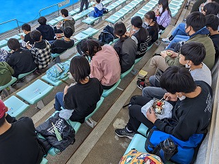 みんな元気に,お家から持ってきたお弁当をイルカショーを行うスタジアムでいただいています。