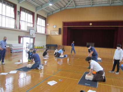26日(木)に教職員研修会として「救命救急講習」を受講しました。上京消防署の署員の方に講師としてお越しいただき,心肺蘇生法やAEDの使い方の実技講習などをしていただきました。