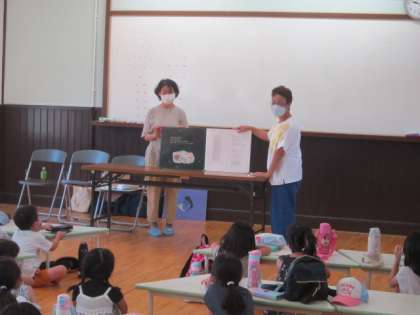 図書ボランティアの方にお世話になり、絵本の読み聞かせをしていただきました。7月の時期に合った絵本を4冊読んでくださりました。読み聞かせの後には、本のしおり作りをしました。